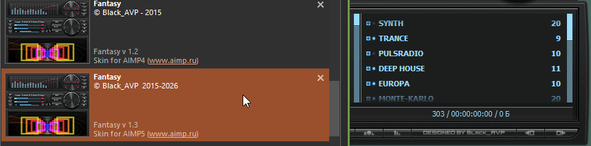 Закройте плеер.скачайте, распакуйте Fantasy_4.zip и положите в "C:\Program Files\AIMP\Skins\"ранее скачанный скин для 5-ки переименуйте в "Fantasy_5" положите туда же (C:\Program Files\AIMP\Skins\).в профиле (~\AppData\Roaming\AIMP\Skins\) удалите всё что связано с "Fantasy"Запустите аимп, и выполните действия описанные в первом посте.