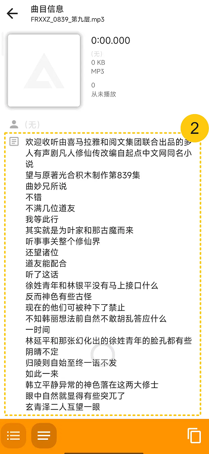 The problem is: when the track plays, the lyrics don’t highlight or scroll in sync with the timing. In the playback screen, the lyrics don’t show up at all.(Screenshot ①)